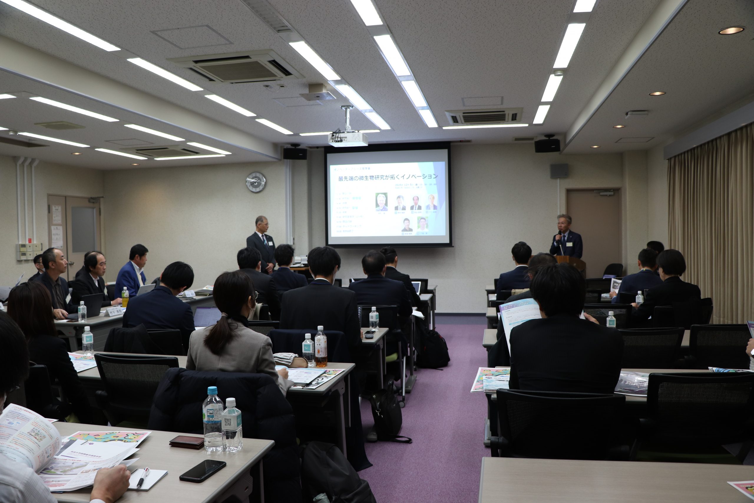今回の見学会は「最先端の微生物研究が拓くイノベーション」と題して、野村暢彦(生命環境系 教授 ・微生物サステイナビリティ研究センター長)、高谷直樹(生命環境系 教授)、竹下典男(生命環境系 教授)、豊福雅典(生命環境系 准教授)、八幡 穣(生命環境系 准教授)の5名の教員から、微生物の制御あるいは利用について研究紹介を行うとともに研究室見学を行いました。